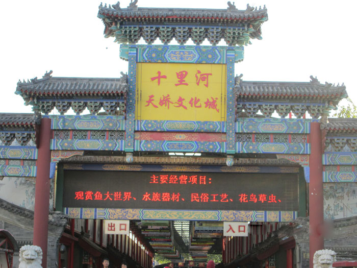 老北京城,遗老遗少,八旗子弟,闲散游民多少都有个嗜好,在京城形成了一个偌大的休闲阶层,一位民俗学 家这样描写北京的养鸟盛况:“下自顽童贫士,上至缙绅富户,无不手架一鸟,倘徉街市,可谓举国若狂”。在明清之际,北京城就是个休闲消费城市,养鸟听音 儿,提笼架鸟,品茗听书,斗鸡斗虫,养猫遛狗,形成形形色色的玩法,有人稀罕什么,什么就走俏,于是形成了大大小小的花鸟鱼虫市场――也就是现在的“十里河天娇民俗文化 城”。来到这里,一进门是一溜热带鱼、金鱼、锦鲤以及用品商店,往里,捣鼓核桃的,卖手串儿的,买葫芦的,花鸟鱼虫各色玩物一应俱全,是现在北京老百姓最爱逛的地方,有很浓的北京民俗味道。